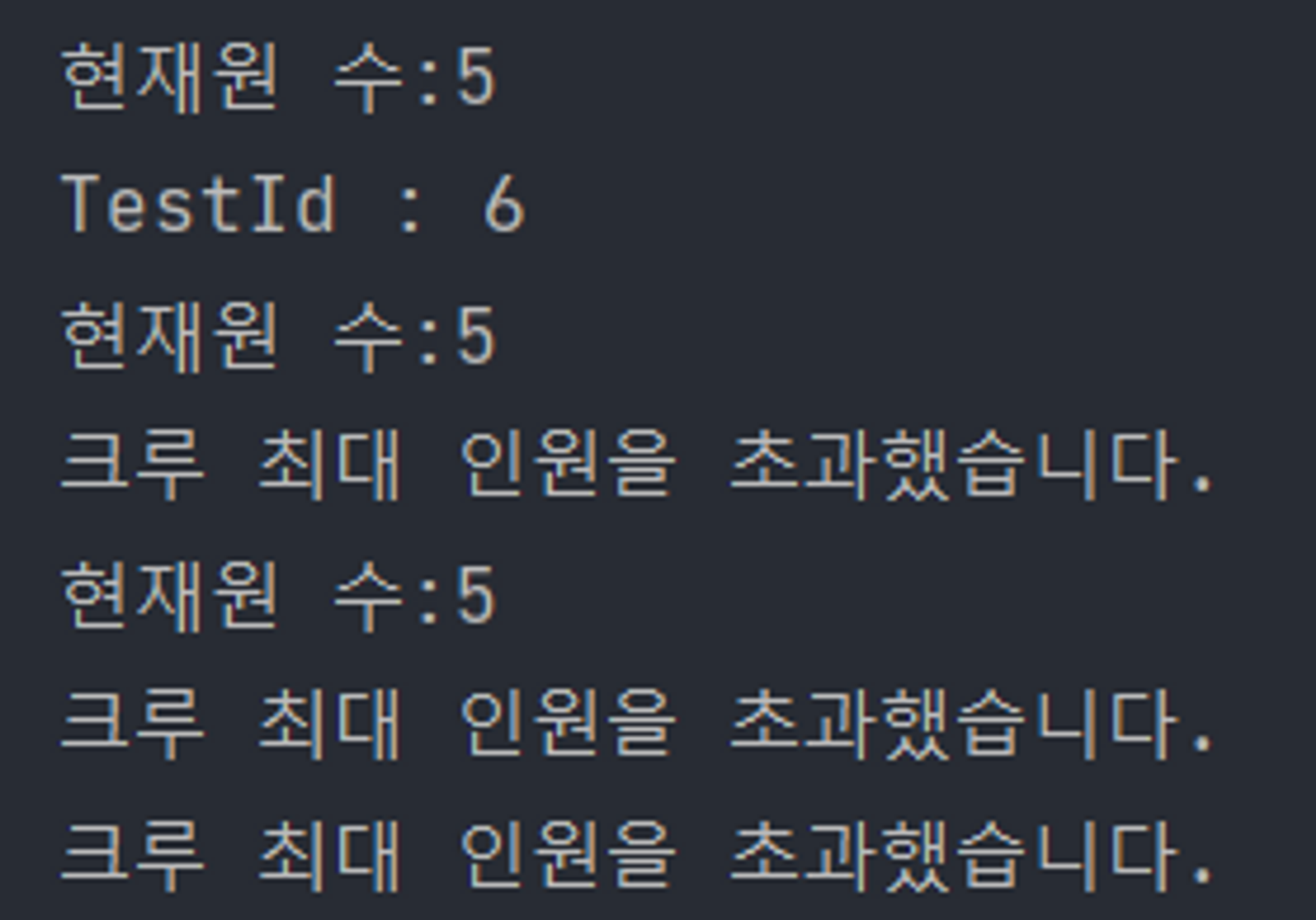 최대인원이 5명이고 현재원이 1명인 방에 여러명을 동시에 승낙받았을 경우, 4명만 들어와야하는데 요청한 7명이 다 들어왔다.