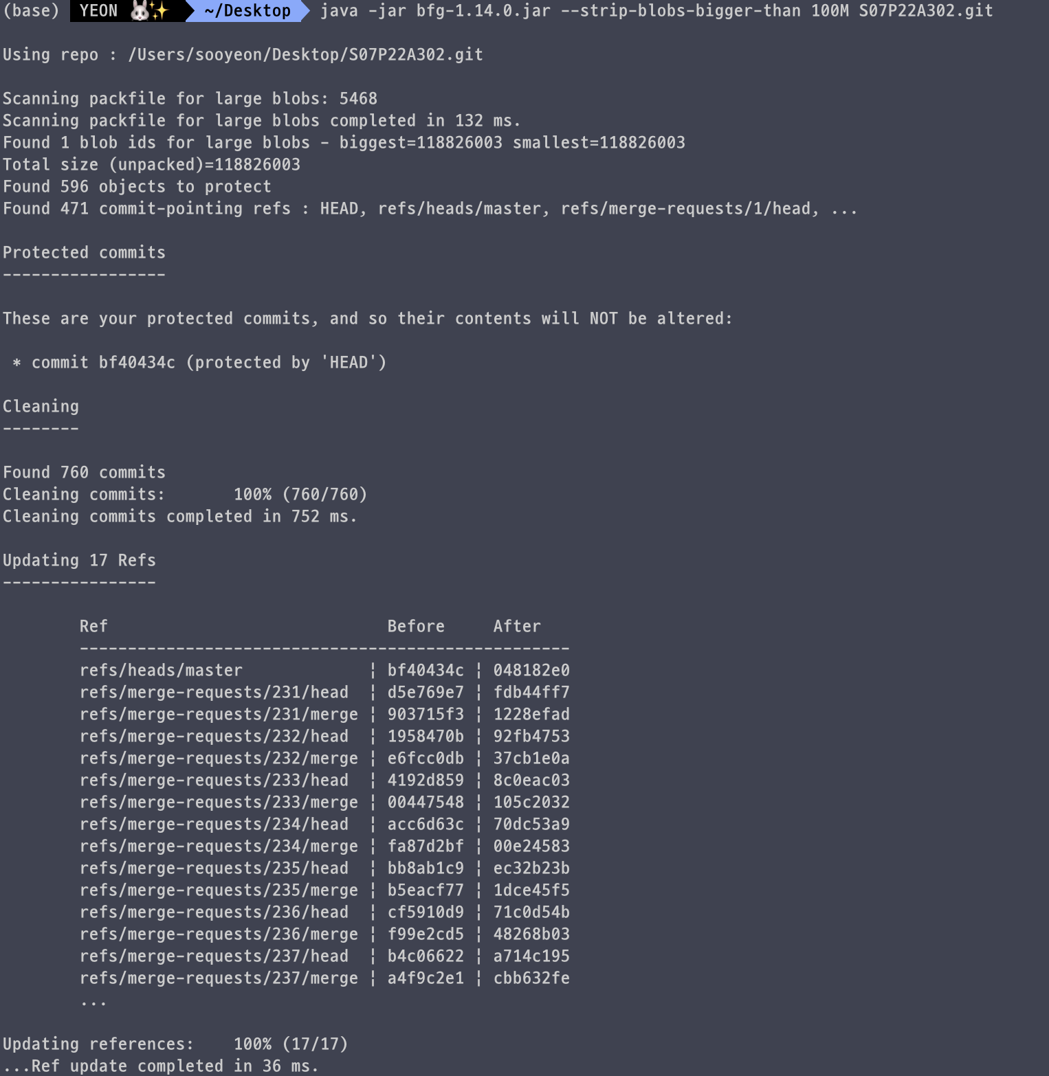 bfg.jar 파일을 다운 받아서 원하는 경로에 다운받아주고 그 bfg.jar파일이 있는 경로에서 clone한 git폴더를 가리키면 된다.